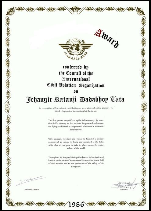“Edward Warner Award” for J.R.D. Tata, the Indian aviation pioneer and long-time Chairman of Air-India.